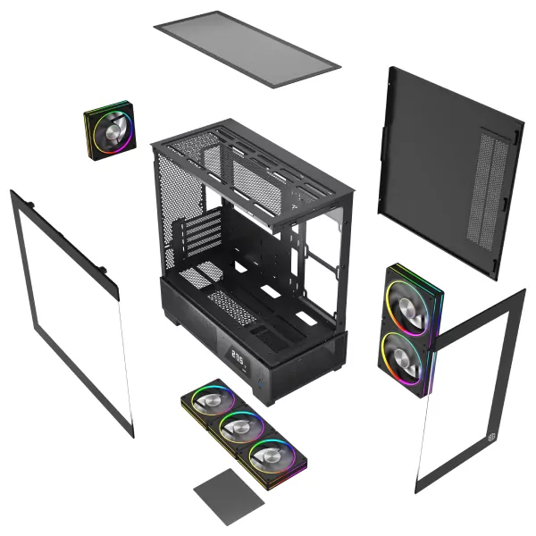 - Densité Extrême : Oui, vous avez bien lu. Ce boîtier compact Micro-ATX est livré avec 6 ventilateurs ARGB pré-installés (3 avant, 2 haut, 1 arrière). C’est du jamais vu à ce niveau de prix.